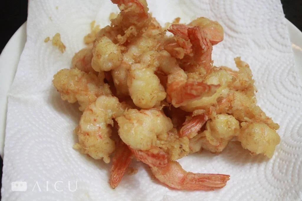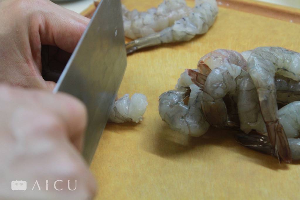 蝦從肚子下刀斷筋,炸出來就不會捲曲,而且可以迅速炸熟。