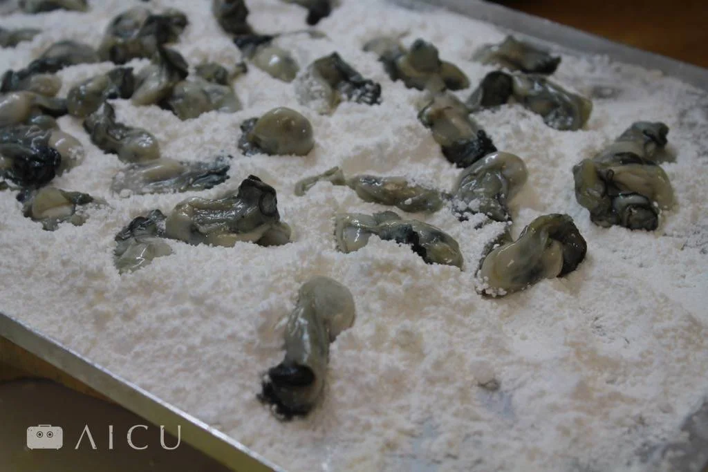 蚵仔用紙巾吸乾水份後裹上三合粉