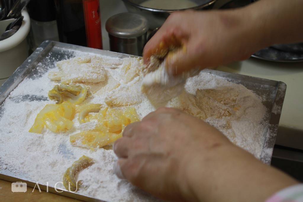 透抽先打顆蛋黃增加黏性,然後再裹上粉。