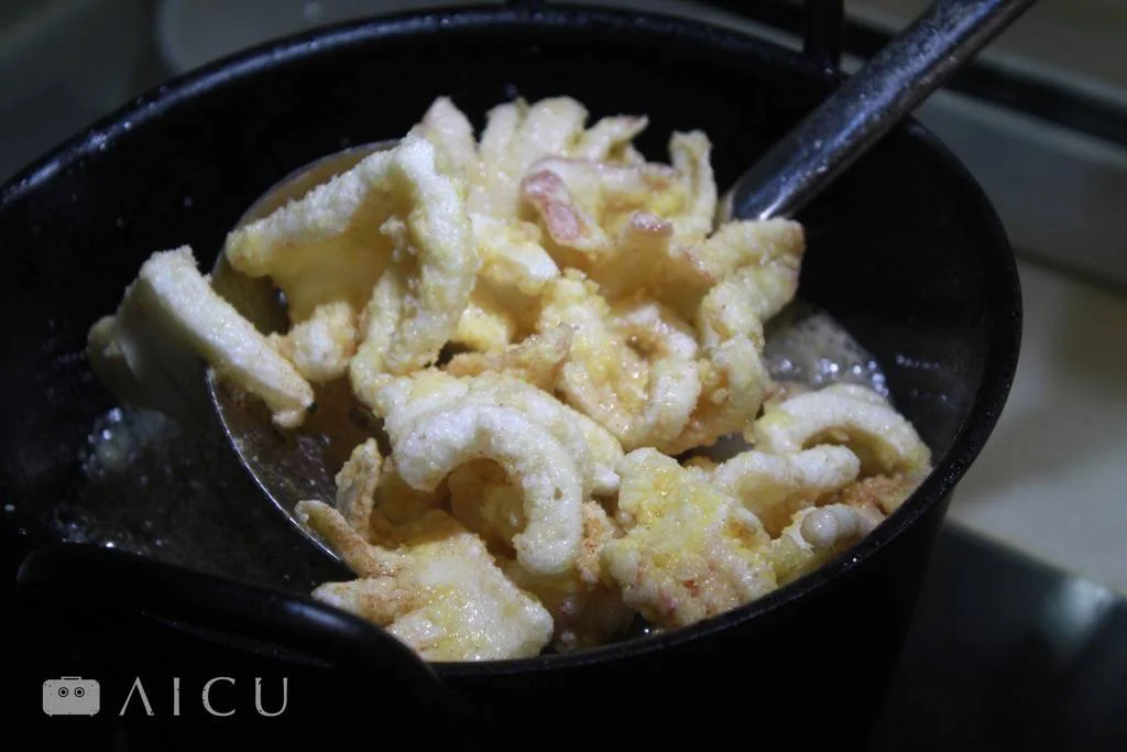- 只要先控制好油溫,使用黑鐵炸鍋能夠穩定的控制恆溫,並且炸蚵仔和花枝,千萬不要一下鍋就攪動。放下去等炸個10多秒之後,再輕鬆用撈杓鬆開,就能一顆一顆不沾黏。