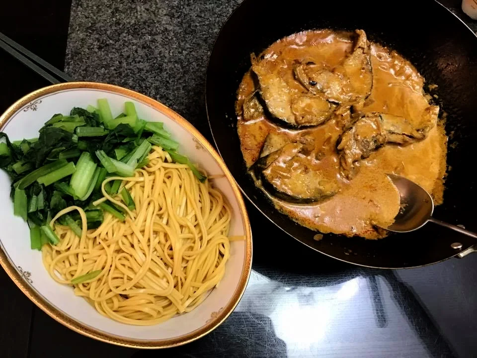 - 燙南瓜麵條、小松油菜、搭配娘惹咖哩烏魚一起食用。