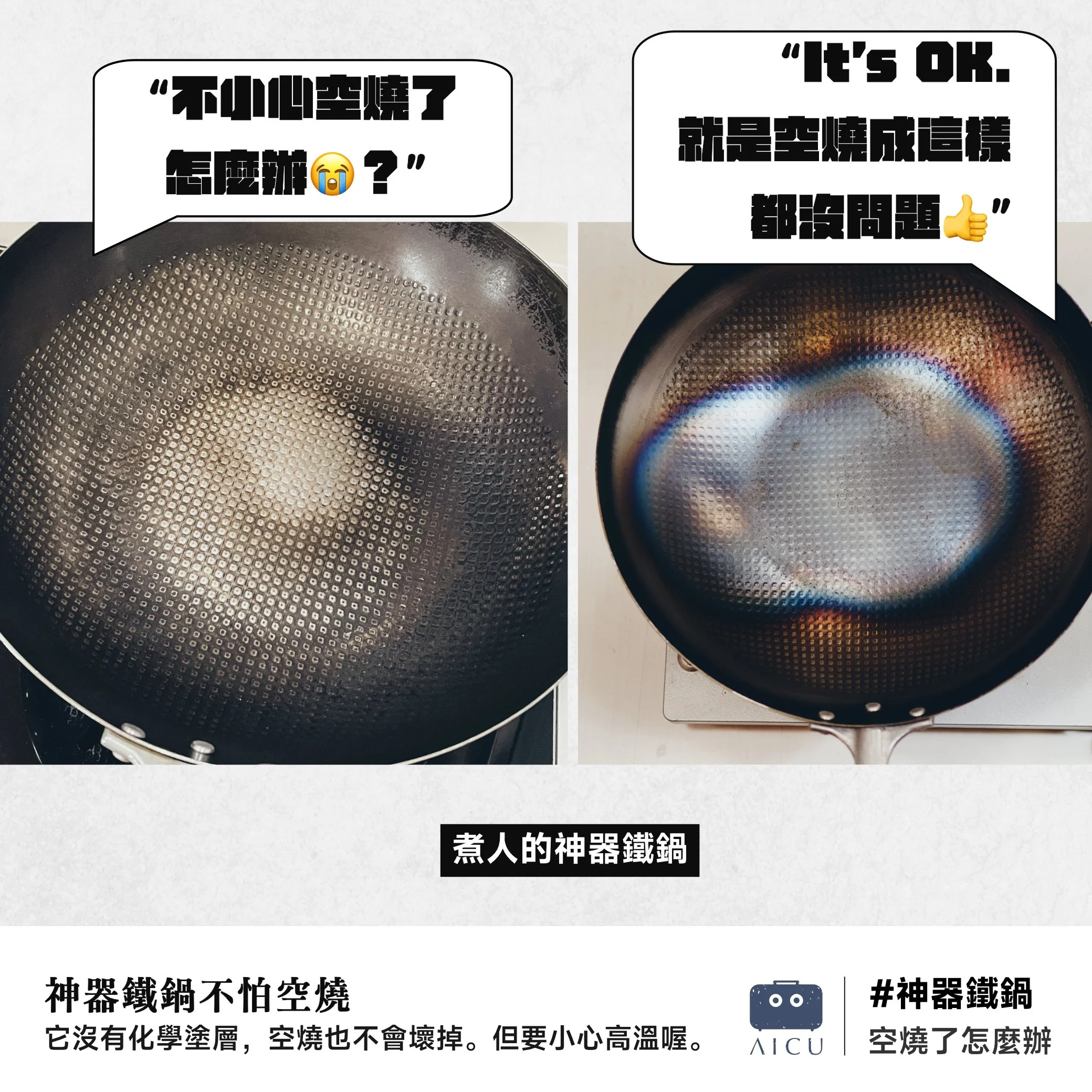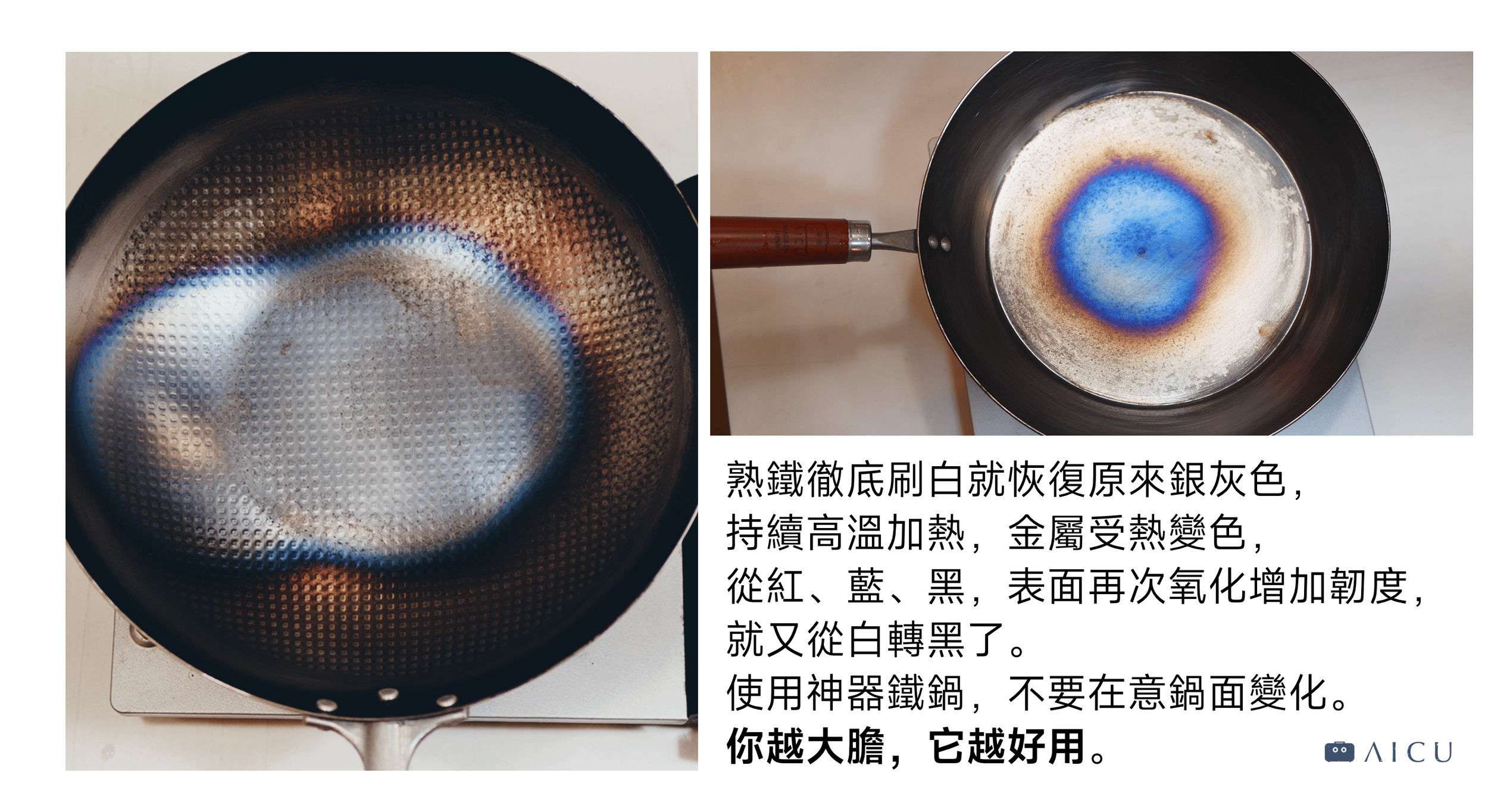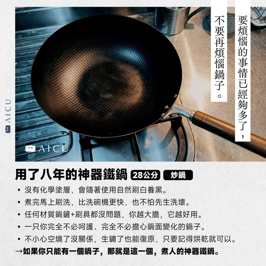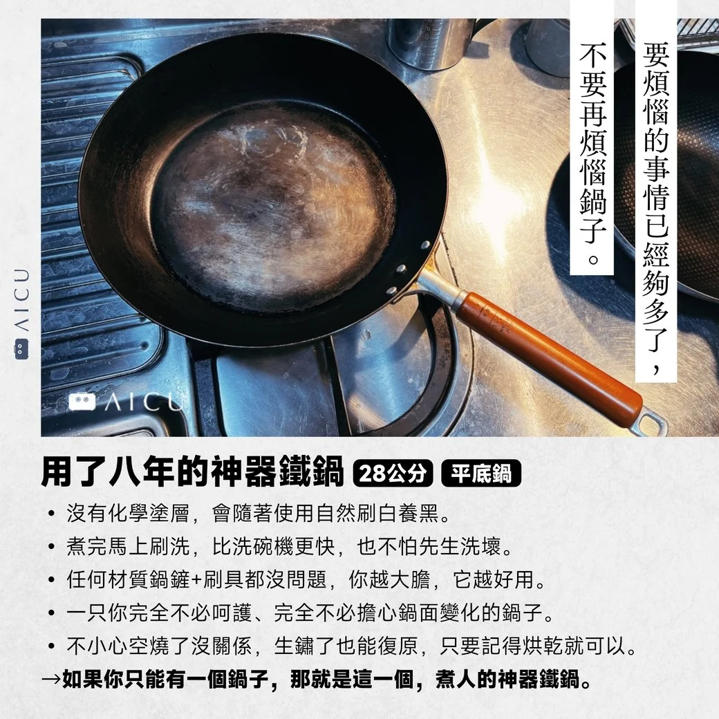 - AICU 神器鐵鍋無化學塗層,清洗與保養方式完全彈性,鍋子的使命是讓料理更美味,而非維持特定外觀。