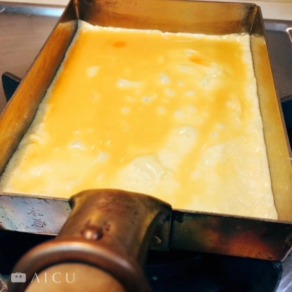 關西風加了高湯,煎起來柔軟多汁;關東風則像是煎小蛋糕似的香甜。煎玉子燒更像是變魔法似的,手腕一翻、長筷迅速地在鍋中折疊來回,一塊方正金黃的玉子燒就完成,而且還非用玉子燒鍋煎得才亮麗完整。